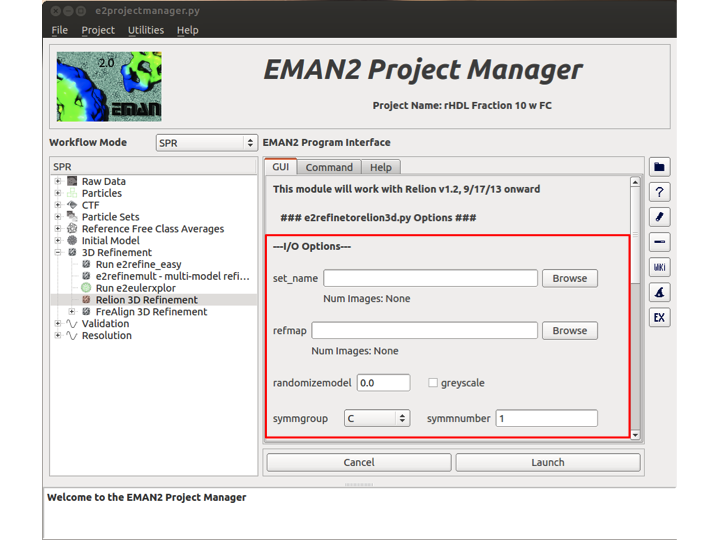 This opens up three tabs in the viewing window: GUI, Command, and Help. 'GUI' contains the options for e2refinetorelion3d.py, 'Command' is the command that will be executed when the user launches the program, and 'Help' is the help text associated with e2refinetorelion3d.py. Along the right side, you will see 7 option buttons with various shapes. (More information about the project manager can be found here) The Three buttons that are directly impacted by this program are:«BR»