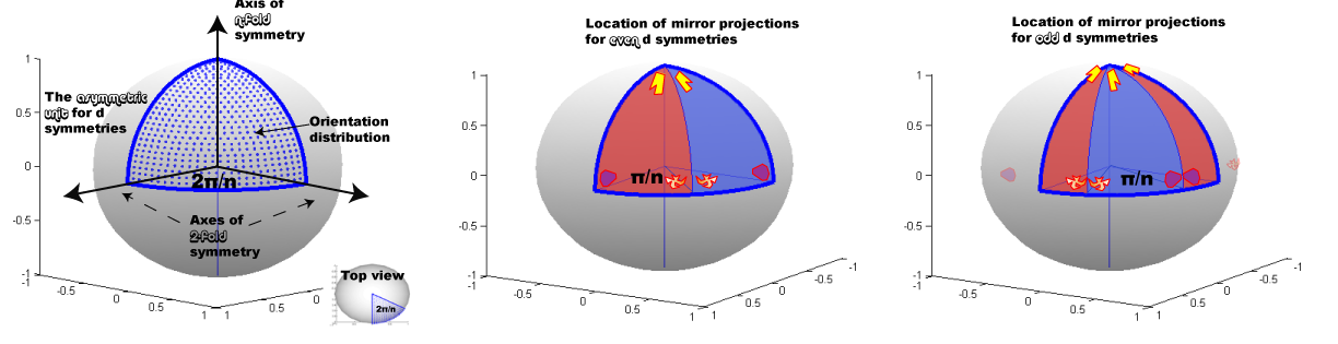 C-symmetry occurs when an object is symmetric about a single axis. The degree of symmetry about this axis is referred to as n. A rotation of 2pi/n about this axis will yield the object in an identical (but unique) conformation. Based on this fact it is possible to define the asymmetric unit for c-symmetries as shown in Figure 1 (left). However, as stated above, half of the asymmetric unit will contain the mirror projections of the other half, and the way in which the mirror projections are arranged respectfully in the asymmetric unit depends on whether n is even or odd. To illustrate this, the behavior of even and odd mirror projections in the asymmetric unit is shown in Figure 1 (middle and right, respectfully).