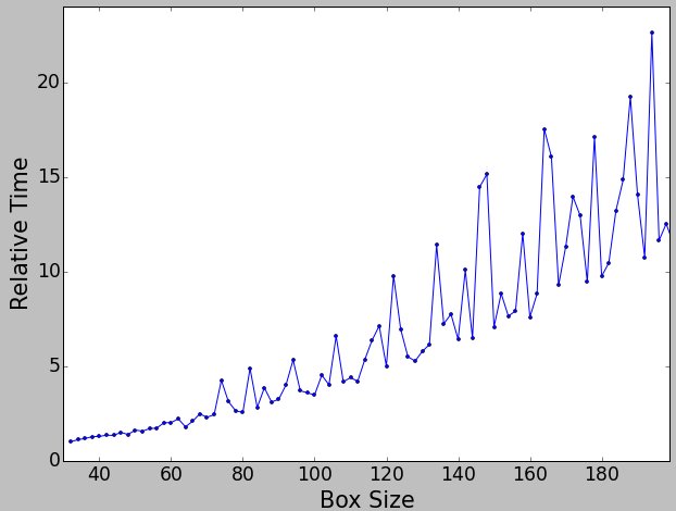 The following plot is a section of the timing tests used to produce the above list (note that the above list was updated using a new calculation, the table below is no longer strictly accurate). This is the time required for a typical set of operations used in 3-D refinement at each size: