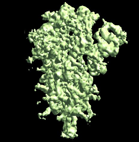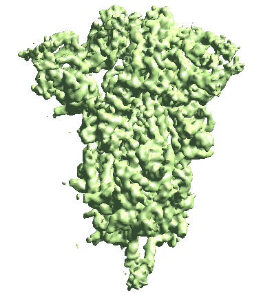 Note when displaying the volume through the Show3D button in e2display browser, the isosurface is automatically colored by the local resolution. Here we can see the tip of the spike is not as well-resolved as the central parts due to structual flexibility. We will address this in the following sections.