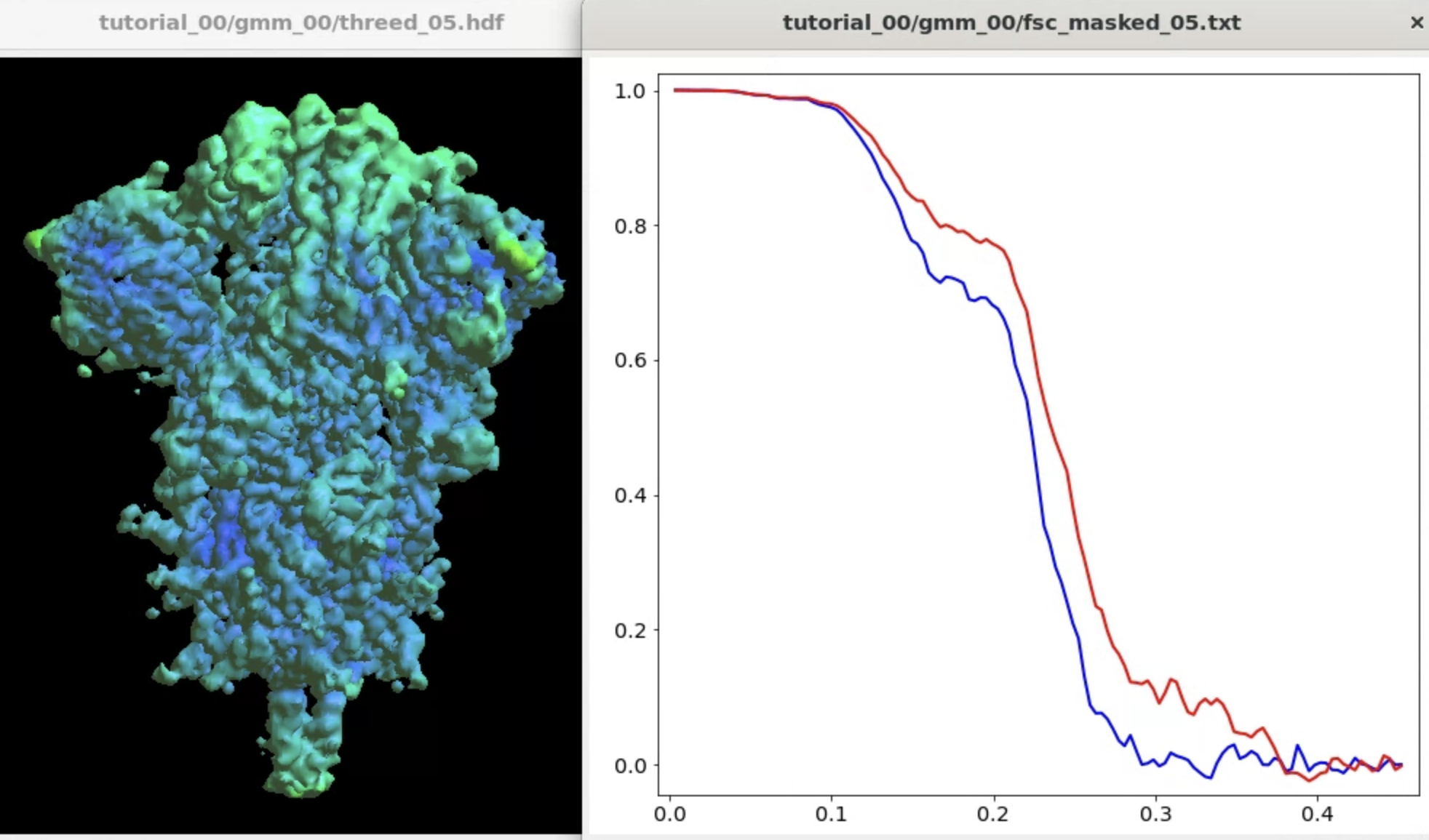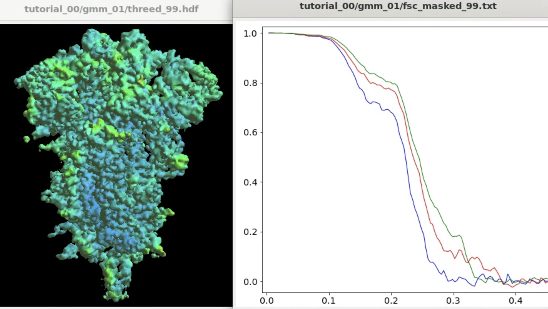 The program will start from the initial orientation assignment and run five iterations of refinement using GMMs as references. It should create a folder called gmm_00, and you can find all files related to the refinement inside. threed_xx.hdf are the reconstructed density maps, fsc_masked_xx.txt are the FSC curves, and model_xx_even/odd.txt are the GMM parameters after each iteration. After the refinement, the resolution should reach ~3.4�.