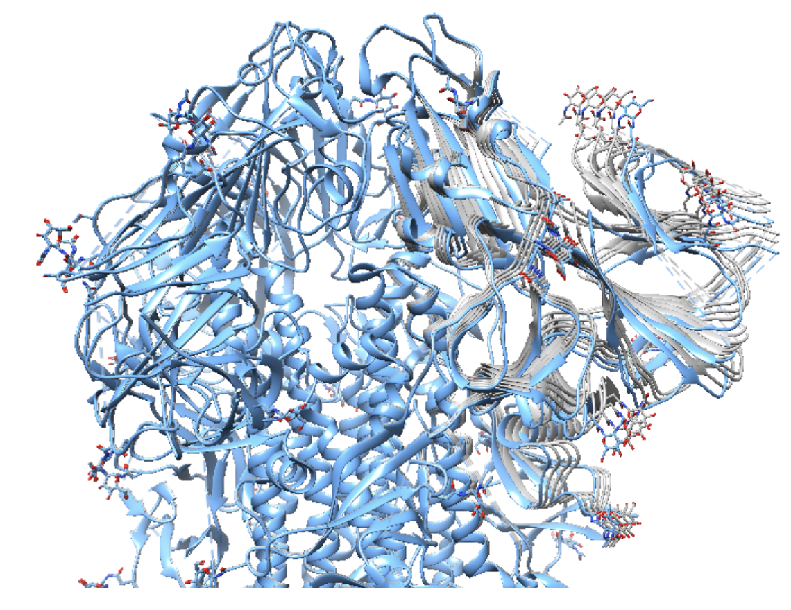 We can also visualize the same movement via molecular models. Here we use the existing PDB file (PDB:6zwv) and morph it using the trained decoder.
