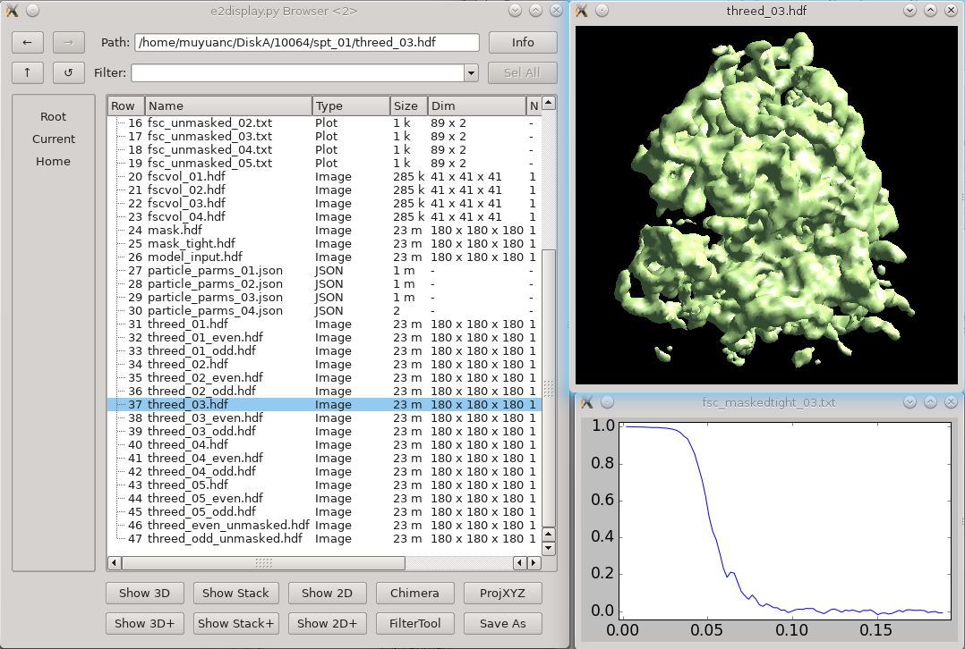 Congratulations! The final result of the tutorial will be found in “subtlt_00/”. The final 3-D map will be “threed_04.hdf” with the default parameters. The final gold standard resolution curve will be “fsc_maskedtight_04.txt”. The optional steps below are tools you can use to evaluate your results in more detail.