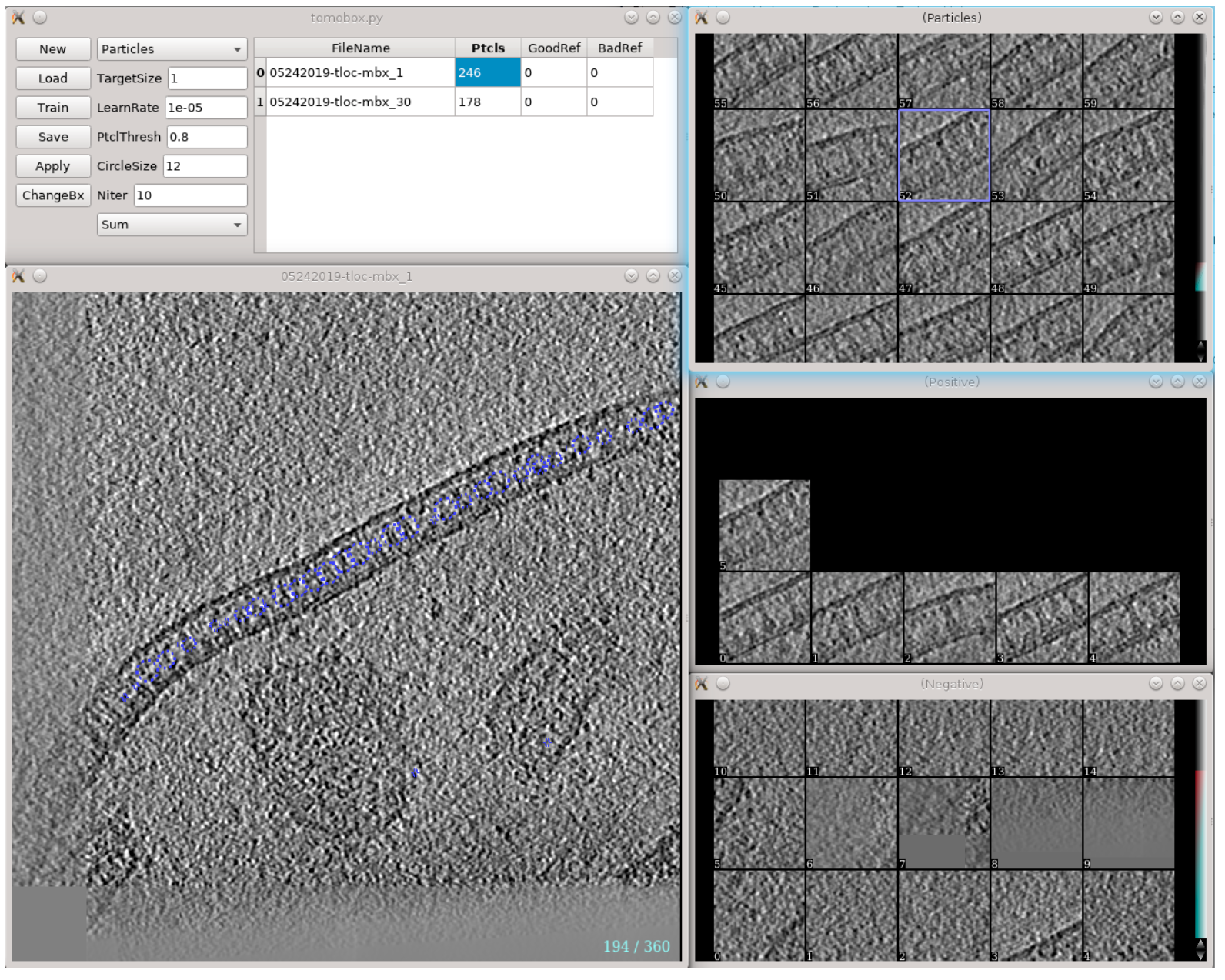 Here label will be the label of the newly selected particle. This will bring up three windows: the main window with various options and a list of tomograms, and two windows (should be empty in the beginning) for positive and negative samples. Clicking any tomogram in the list will bring up two other windows: the slice view of the tomogram and the list of particles under the given label. Here is a simple workflow.