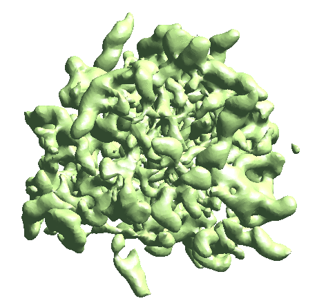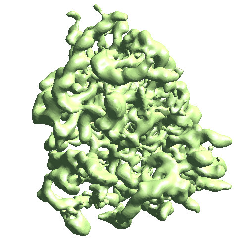 Note that since we want to look at the motion of the masked domain within the coordinates of the original refinement, here use the old aliptcls2d.lst file. If the goal is to visualize the motion of other parts of the protein with the focused part fixed, use the newer aliptcls2d file. The program will output two 3D map stacks corresponding to the trajectories of the first two eigenvectors. They can be filtered/masked manually with e2proc3d.py before visualization.