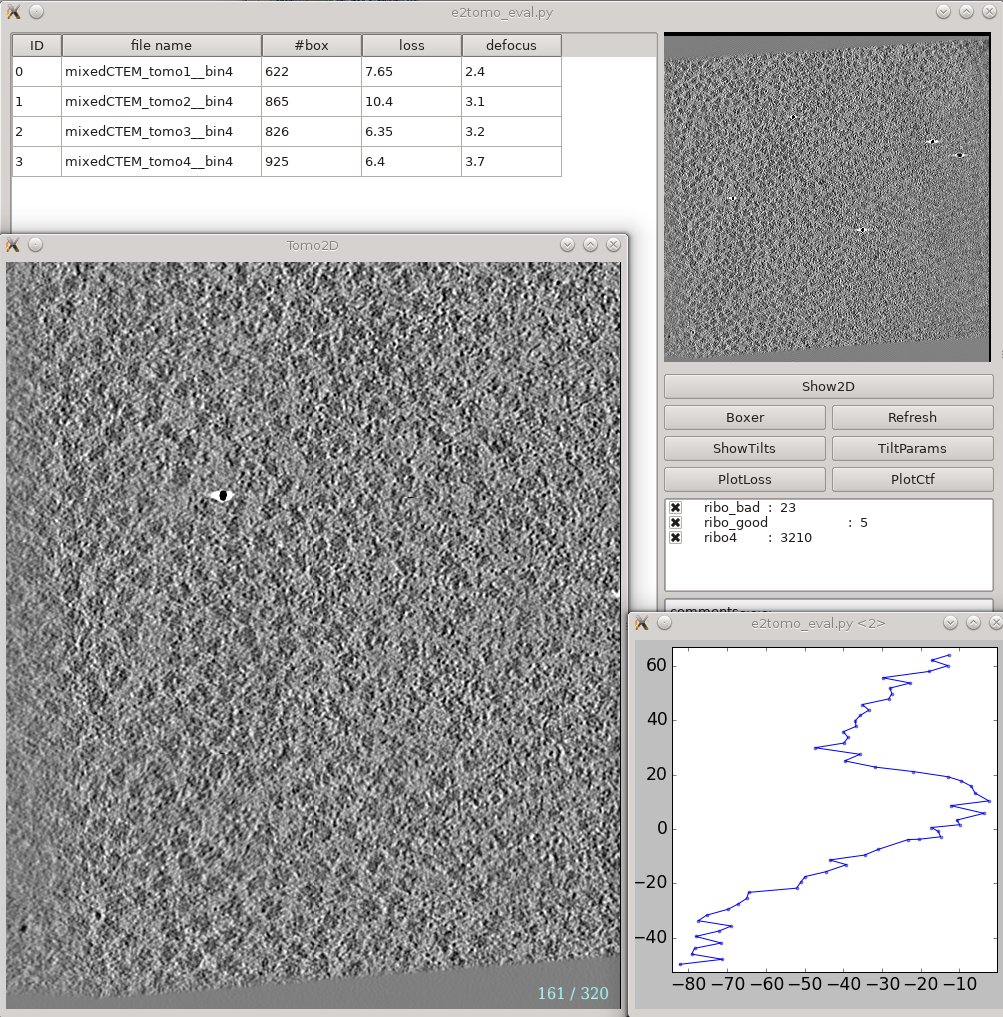 Analysis and visualization → Evaluate tomograms can be used to evaluate the quality of your tilt series alignments and tomogram reconstructions. This tool will show more information as you progress through the tutorial, but can be used already at this point to make various assessments of your tomograms. Note that some of this information may not be available if you had notmp checked during the reconstruction.