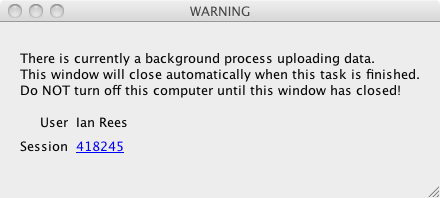 The “End” button to the right of the “Session” timer will end your session and mark it as completed in the database. Any files that are currently queued for upload will continue to upload in the background as long as the machine is online. A warning dialog will be displayed to other microscope users to indicate this status. It will automatically close out and exit once the upload queue is finished.