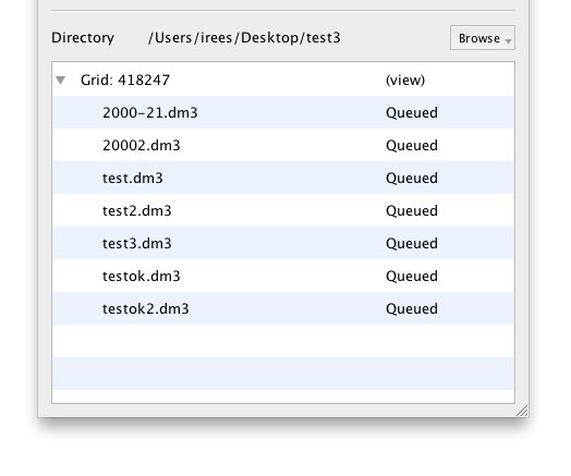 EMDash will watch a directory for new files. New files will be added to the watch list, and CCD frames will be start to upload within seconds. To set the current watch directory, click the “Browse” button and select “Select directory.” Use the normal file dialog window to find your data directory and confirm the dialog.