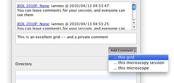 You can attach comments to either your Microscopy session – which is considered public – or your Grid Imaging session – which is restricted to members of the selected project.