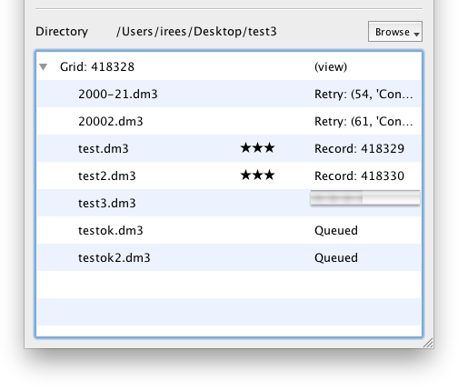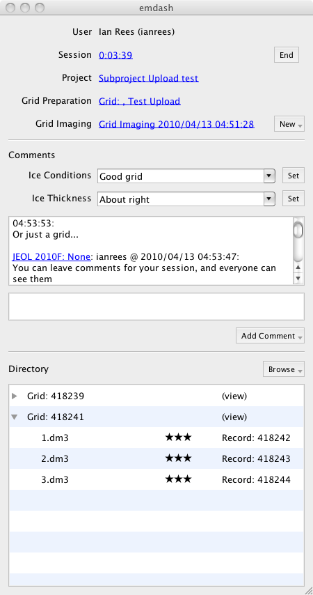 Be aware that, unlike CCD frames, you must have significant free space on the main hard disk available to upload stacks. EMDash, like emen2client, extracts all the slices and uploads each file individually. This was done for historical reasons, but since the file transfer capabilities of EMEN2 have improved, this may change in the future – e.g. all stacks will be uploaded as-is and processed on the server.