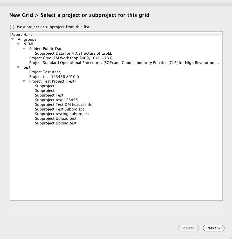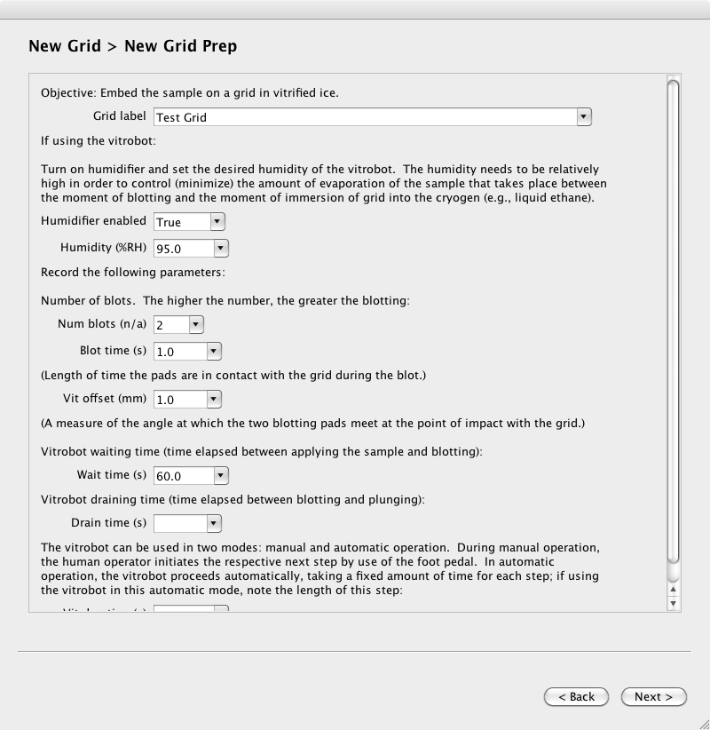 First, select the “New” dropdown to the right of “Grid Imaging,” and select the option to create a new grid imaging session. You will be guided through a wizard that will ask you to select a Project or Subproject, enter the freezing details of the grid and any other preparation techniques used, and enter the basic overall parameters for this grid imaging session.