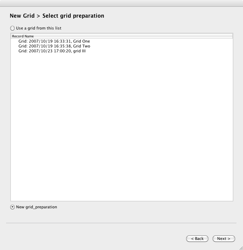 Page 2. Select a grid, or prompt to create a new grid. If you select an existing grid, you will skip the next screen.