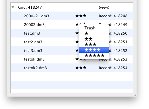 Note the actual rating system stored from 0-10 inside EMEN2 and EMAN2 for compatibility with existing convention; the five star range was chosen for simplicity. The stars are scaled by the following stars:rating; 0:0, 1:1, 2:3, 3:5, 4:7, 5:9.