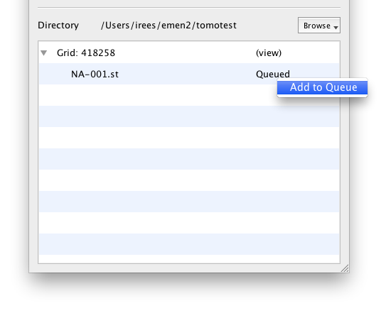 Because stack files are written in append mode until SerielEM is finished with the entire tomography stack, you must manually tell EMDash when to begin the stack file upload. Click in the area labeled “Waiting” and select “Add to Queue.” The stack will begin uploading immediately. There is a minor issue with status messages and progress being reported back to the GUI at the moment – you will want to keep an eye on the console log to follow the progress of your stack file upload.